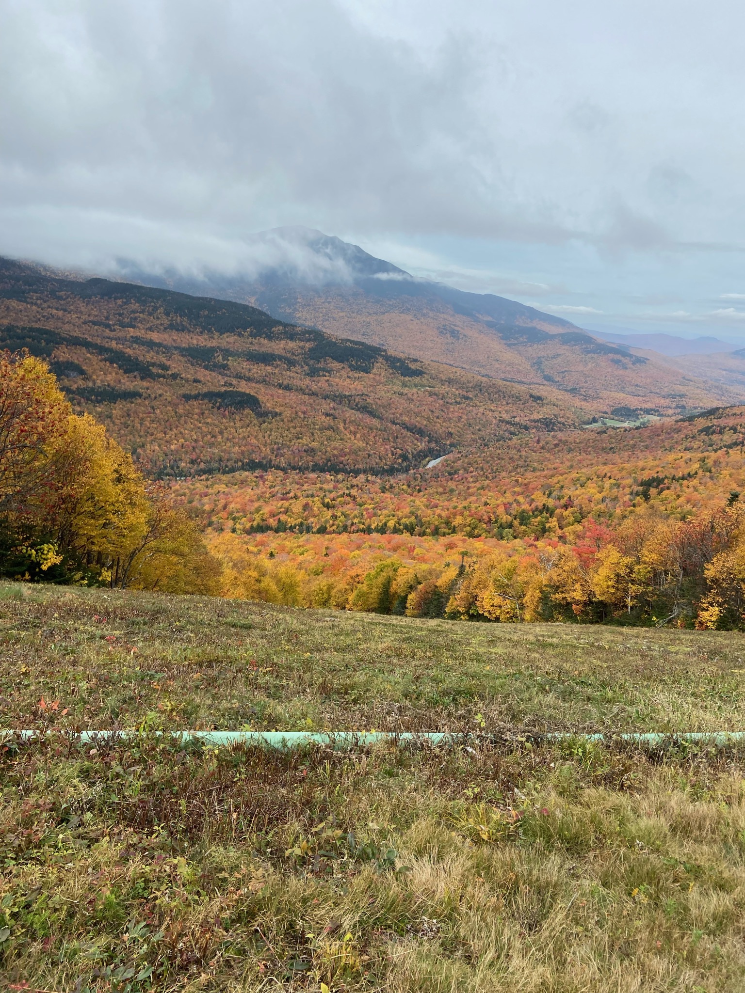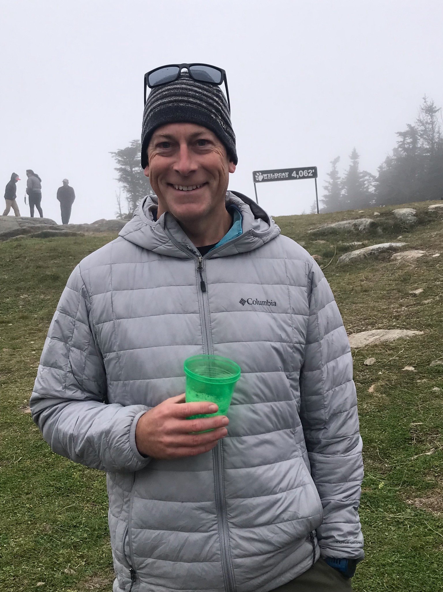 We had a quick snack and it was onto Wildcat D via Wildcats B & C which provided to be a pretty nice ridge walk up and over both. The descent off C was steep rugged and slippery as everything was wet from the mist and drizzle of the day which was not burning off at all. The ascent up D was also pretty steep but before we knew it we hit the observation deck which is the true summit of Wildcat D. There were a few groups of people up there and it actually proved to be very anti-climatic for my final peak as I ascended the steps of the observation deck and had stunning views of the inside of cloud. Jen followed and congratulated me with our traditional summit kiss. We stood there for a bit and it still hadn’t really sunk in for me yet as I knew that my parents and the girls were waiting for us about .1 mile down a steep and rocky trail at the chairlift. We slowly made our way down and found them waiting in the wind and mist. I was very happy to see them and so grateful that they decided to spend their Sunday in the clouds and cold to celebrate on top of my 48th peak. We sipped some champagne and blew some noisemakers (which Jen had coordinated with my parents the day before) and in typical fashion my mom had gifts to give us in the form of really cool NH48 shirts. On a nicer day we would’ve hung out at the top longer but it was cold enough for hats, gloves and puffy jackets so we decided that Jen, Caitlin and I would start heading down Polecat (green circle ski trail) down to the lodge where they had parked and we would go out to lunch somewhere in the area. I was so happy that Caitlin wanted to hike down with us and she pushed the pace for us as we made it down in record time. Ski trails can be a bit boring and tedious to hike on but we found Polecat to be a nice break from our normal boulder hopping descents which are brutal on the knees. As we were descending the clouds started to burn off and the sun started peaking out giving us the best views of the day. It was about 60 and sunny as we made our way to the base lodge and we saw a wedding party on the way up to the summit for photos – we wished them congrats and hoped the clouds at the summit also burned off.