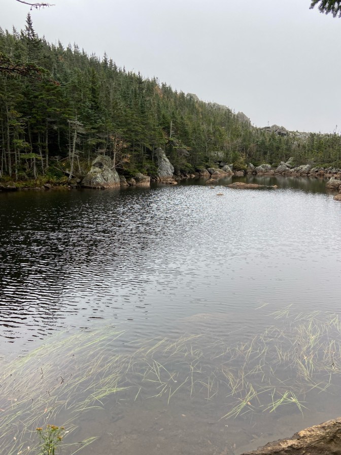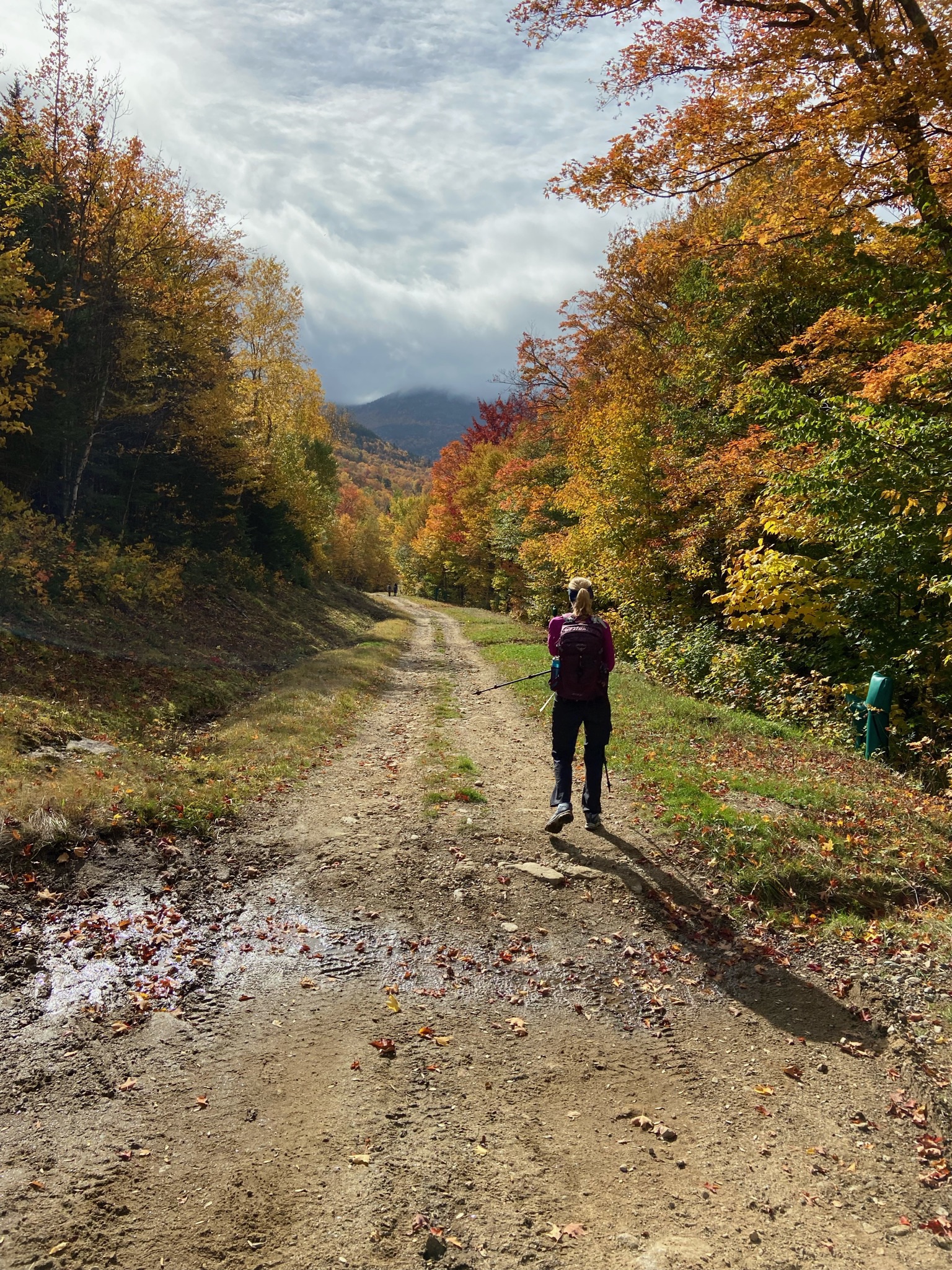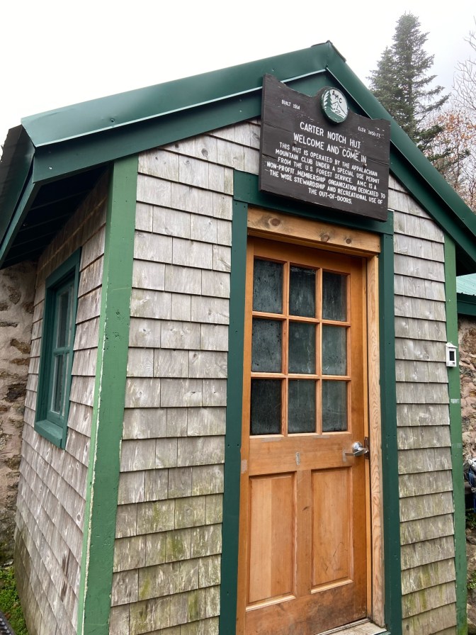 We started out on the gradual and very picturesque 19 Mile Brook Trail, this trail was quite familiar to us as this would be our 5th time on it in the last year as we used it to hike Carter Dome as well as Middle and South Carter and Mount Hight. It has become one of our favorite trails in the White Mountains as it follows the bank of the 19 Mile Brook and provided a nice warm up for what we new would be a pretty steep ascent up to the Wildcat A Ridge. The sky was overcast and the light was perfect to bring out the explosion of color of what was peak foliage. We made very good time as we hustled along to the junction of Carter Dome Trail and we happily continued straight into unchartered territory for us on the upper end of 19MB – Carter Dome Trail is not a favorite (see previous post for M & S Carter). The trail became a bit more rugged although still not steep and was pretty wet from the stretch of rain we had recently. Jen and I were both pretty quiet at this part of the hike just enjoying being in beautiful woods together with surprisingly very few other people around. This is something that I really love about Jen, we can both just be around each other without feeling the need to chit chat and fill the silence with words, we can just enjoy the silence and enjoy being in each other’s company in an unspoken beauty. I was reflecting on all the hikes that I had taken that has brought me to this point but I was also worried about the weather (which seemed to be getting worse by the minute) and having my 70 year old parents and my teenage girls begrudgingly waiting in miserable weather at the summit for hours as we had mistakenly calculated wrong. I often fill my time hiking with (fuzzy) mental math of mileage and elevation gain by using my constant stream of data from my Garmin Solar Instinct which has proven to be both a blessing and a curse. As we got to the junction of of Wildcat River and Wildcat Ridge Trail we had an option to hike .3 down to the Carter Notch hut which was the only hut in the Whites I had yet to visit with a side bonus of seeing the Carter Lakes and since I’m a sucker for alpine lakes and my fuzzy math calculations seemed to put us a bit ahead of schedule (and we had to use the privy) so we made the decision to go check it out.
