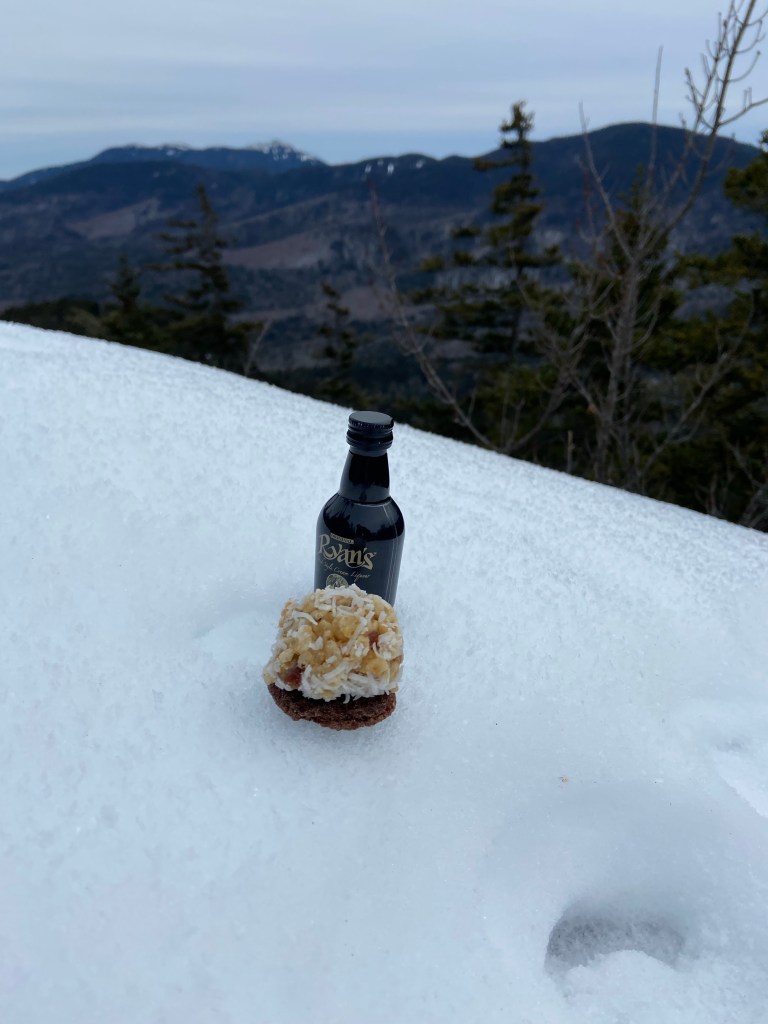 We got back on the main trail for the final push to the summit which proved very tricky to locate. Apparently there is a marker on the ground which of course we couldn’t see as it was covered in snow. We kept hiking along the ridge of Hedgehog and we declared a few times that this must be the summit so we took a few pics and then kept going to find another area that MUST the summit. This happened two or three times until we came to a large outlook overlooking mounts Passaconaway and Pagus. We made that our summit and we cracked open a small nip of Baileys Irish Cream and some of our snacks which included these killer coconut date balls that Jen made for the holidays. After snapping some pics and scarfing down snacks we made our way down the ridge off Hedgehog which had some great outlooks off some pretty steep rock cliffs. We never felt unstable but it would probably be a good idea to keep dogs on leashes and kids close by on these areas. From some of these areas you can look back from where you were standing just a few minutes ago and you can sort of see why its called Hedgehog Mountain. The sparse pine trees on the rounded summit vaguely resemble a little critter of some sort, I suppose and apparently that critter is a hedgehog.