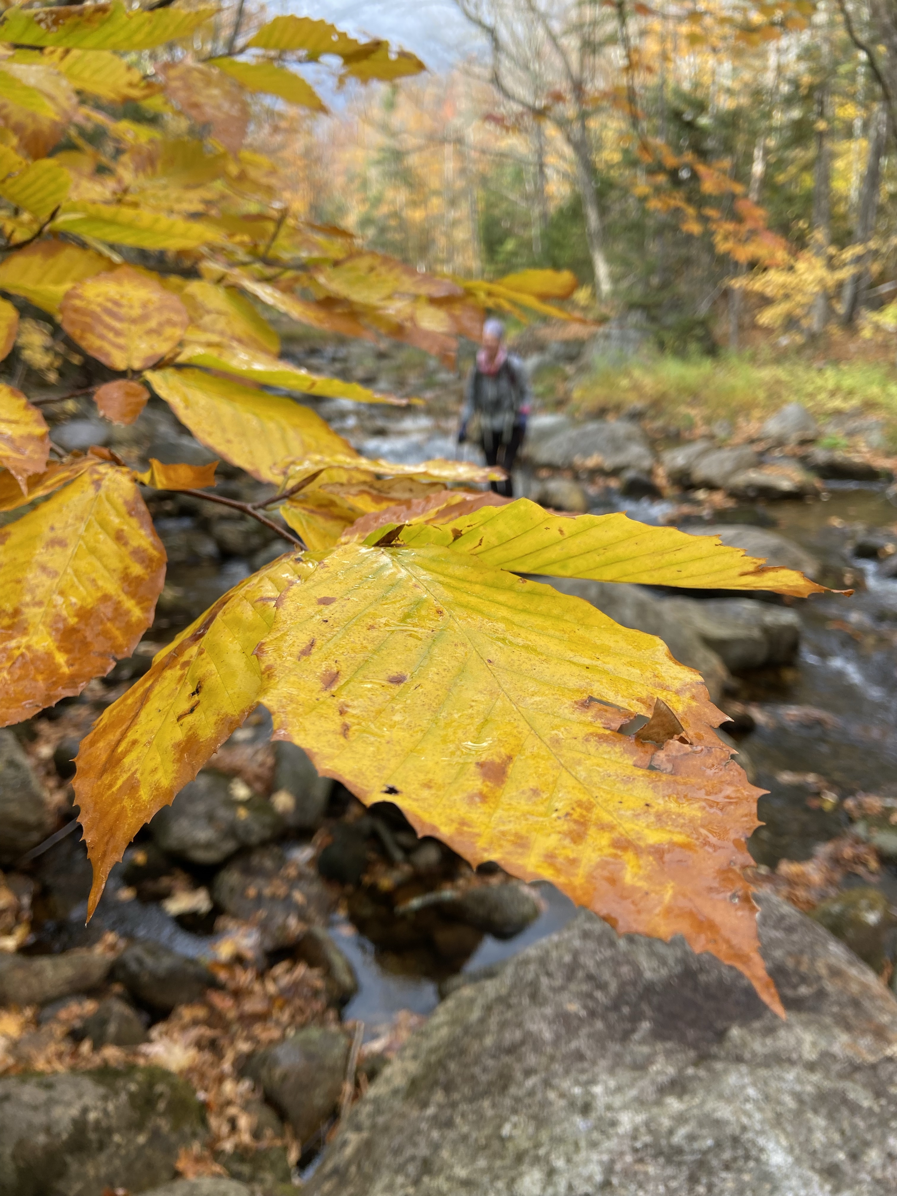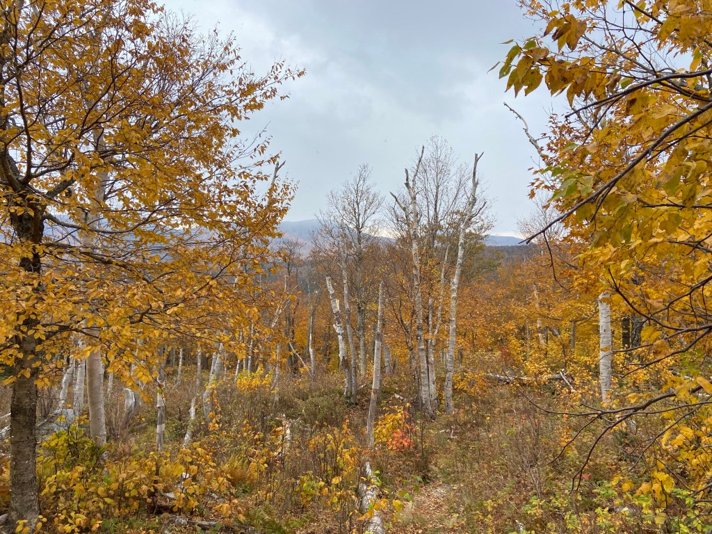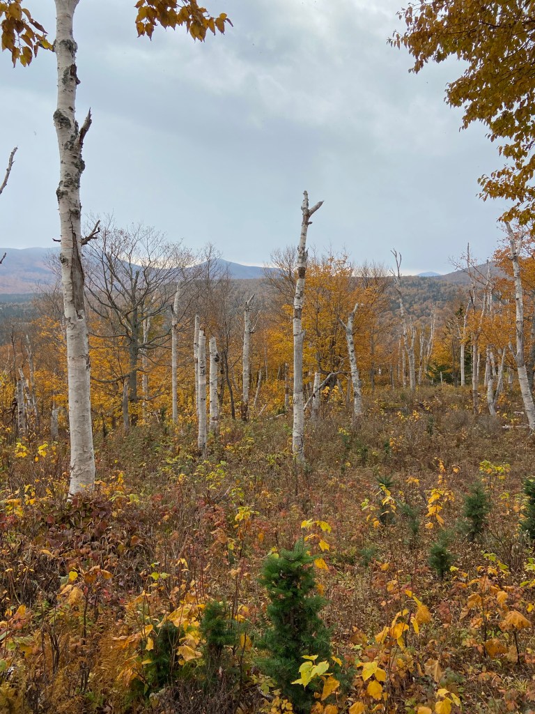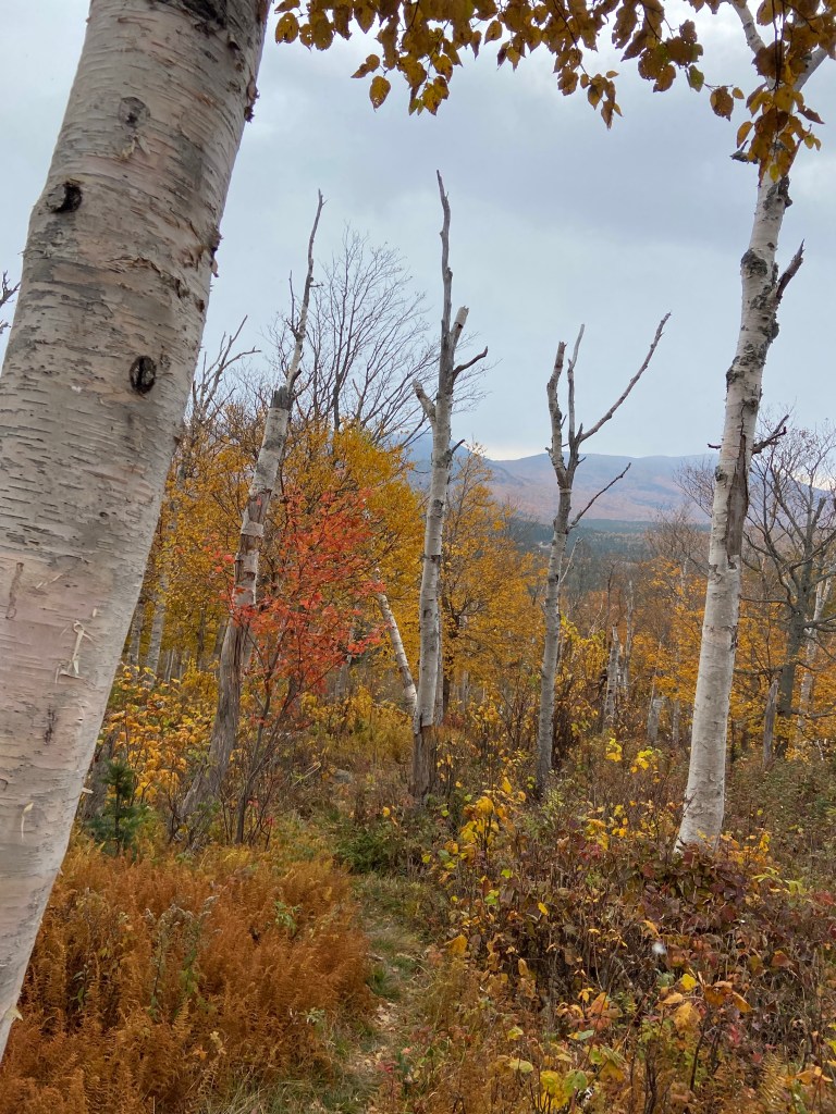 I’ve been pushing for this hike pretty much since I stumbled onto it by watching one of the very few YouTube videos on the this trail. The Rainbow Trail is widely regarded by those who know as one of the most unique and beautiful (especially at peak foliage) as one of the most gorgeous trails in NH. It has a very unique, large clearing which we later learned was caused by a massive forest fire over 100 years ago and what has grown up are sporadic birch trees which add a bit of depth and beauty which would otherwise be a ~10 acre field with the Rainbow Trail cutting right through. I talked it up quite a bit to Jen based on the research I had done and was hoping that it lived up the hype. When we started up the trail it started raining ever so slightly but then picked up a bit as we got further into the trail. I was getting nervous that this was going to be a total washout of a day which we were prepared for in regard to gear, but this was not how I envisioned this playing out in my mind. I knew we were getting close to the birch glade as I was tracking our progress on my GPS app (FarOut) and as we crested a steep section, not only did we get our first glimpse of the glade, but it started to snow! It was the first snow that Jen and I had seen since the spring and there was something about standing in the middle this beautiful birch glade together in silence but totally connected with the snow gently falling on us as that made us both a bit emotional. Although neither of us are religious it was a beautiful, spiritual moment in which we were so present in the moment and truly grateful to be fortunate enough to be there in that time and place together. Its a a feeling that I hope everyone feels at some point in their lives at least once because it truly was special. Here are some of the best photos from the glade taken directly from the trail.
