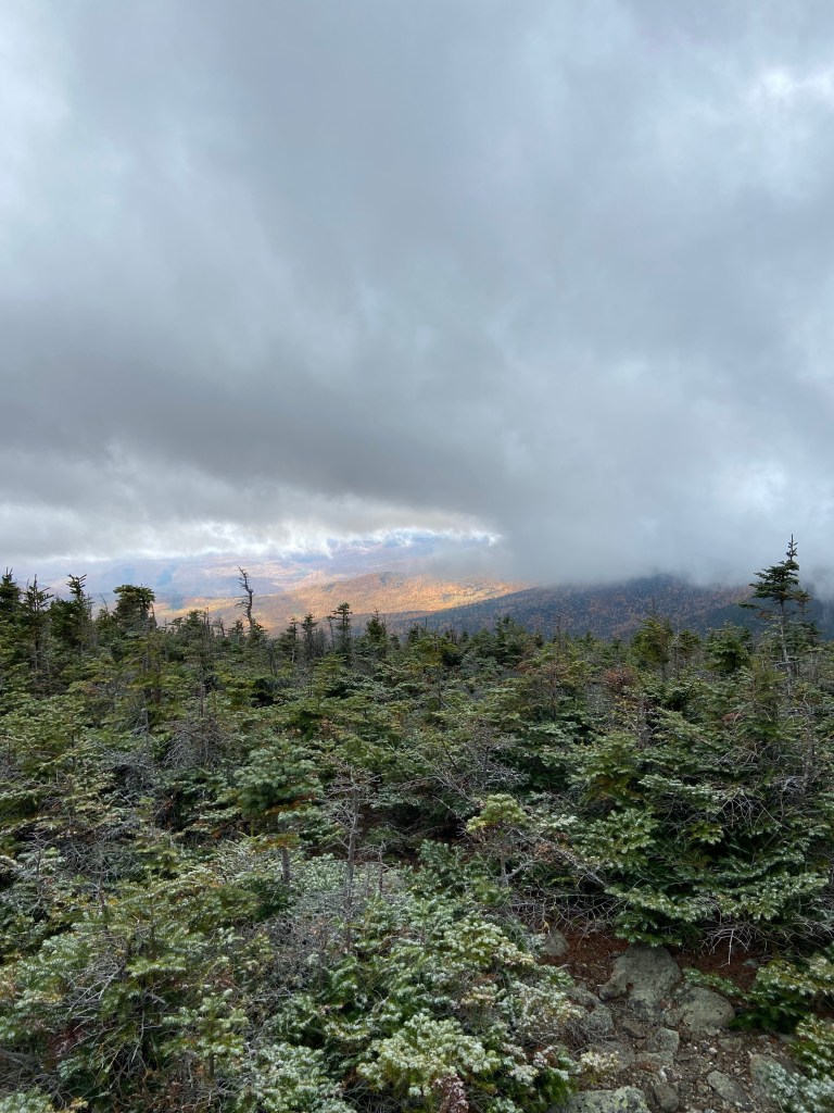 We spent a good 20 minutes standing in the glade and just enjoying the views and commenting how hard it was to leave but we knew that we still had a lot of hiking ahead of us and if we wanted to get back to the car at a reasonable hour we had to get going. I know that we will definitely be back to the glade and it will be interesting to see how it looks different in different times of the year. I’m not sure it can get more beautiful than it was at this time and place but its definitely worth the hike up to find out. As we made our way out of the glade I commented on how it looked like the glade may have been bigger at one point as many evergreen trees were growing up in the middle of birch trees – it will be interesting to visit this area in twenty years from now to see how it has changed. Hopefully we will be lucky enough to be able to hike in to see this place twenty years from now! As we made out way up towards the summit of Carter Dome the snow became more steady and started accumulating on the green moss of the evergreen forest which made a very beautiful contrast of greens, whites and occasional oranges from the few birch trees which were still growing at elevation. We quickly made our way up to the knob below the Carter Dome summit which seems like would have pretty good views on a nice day but not this day, although we could seen sun peaking through the clouds and snow on a neighboring mountain hoping that it would make its way to us.