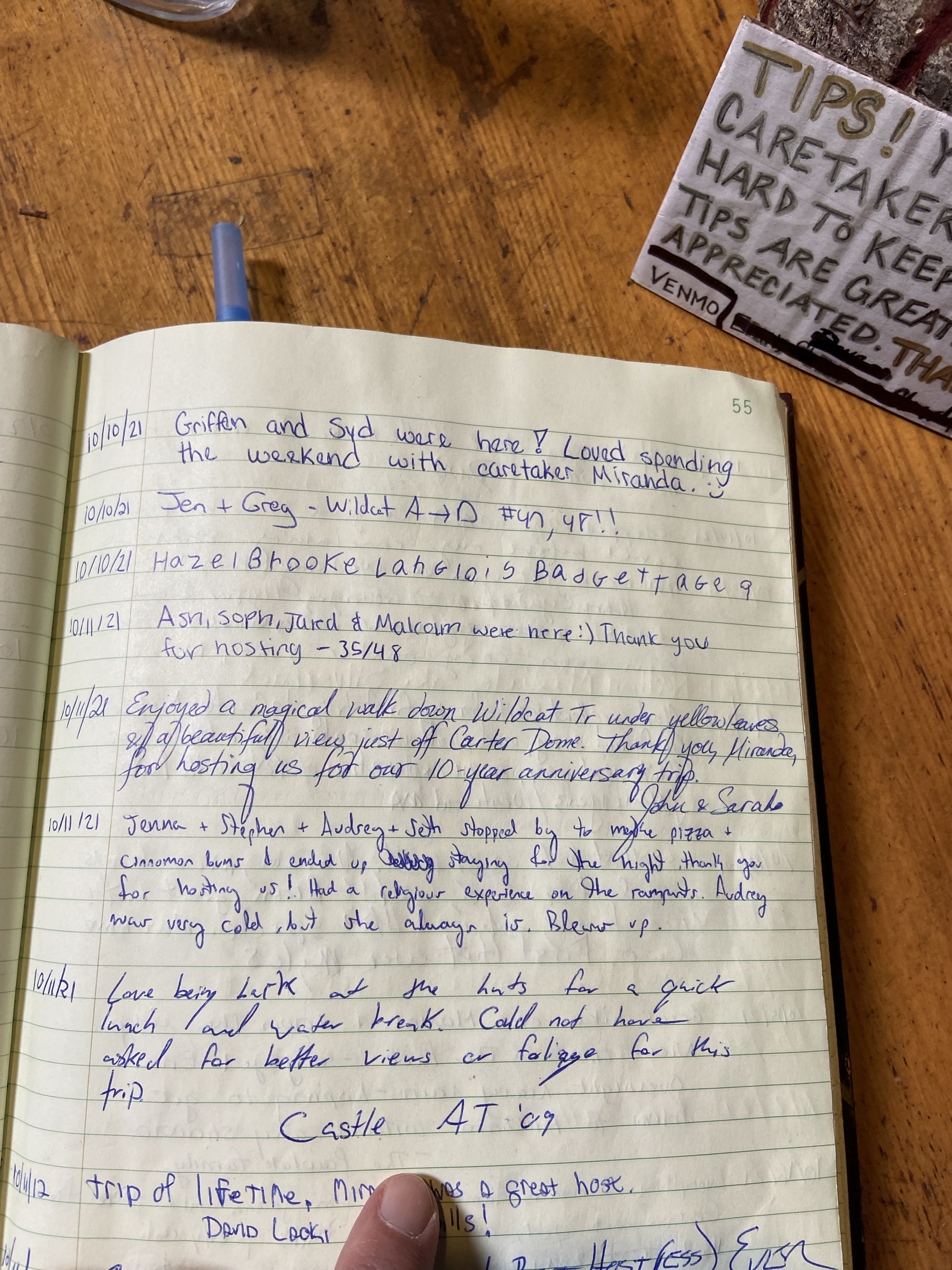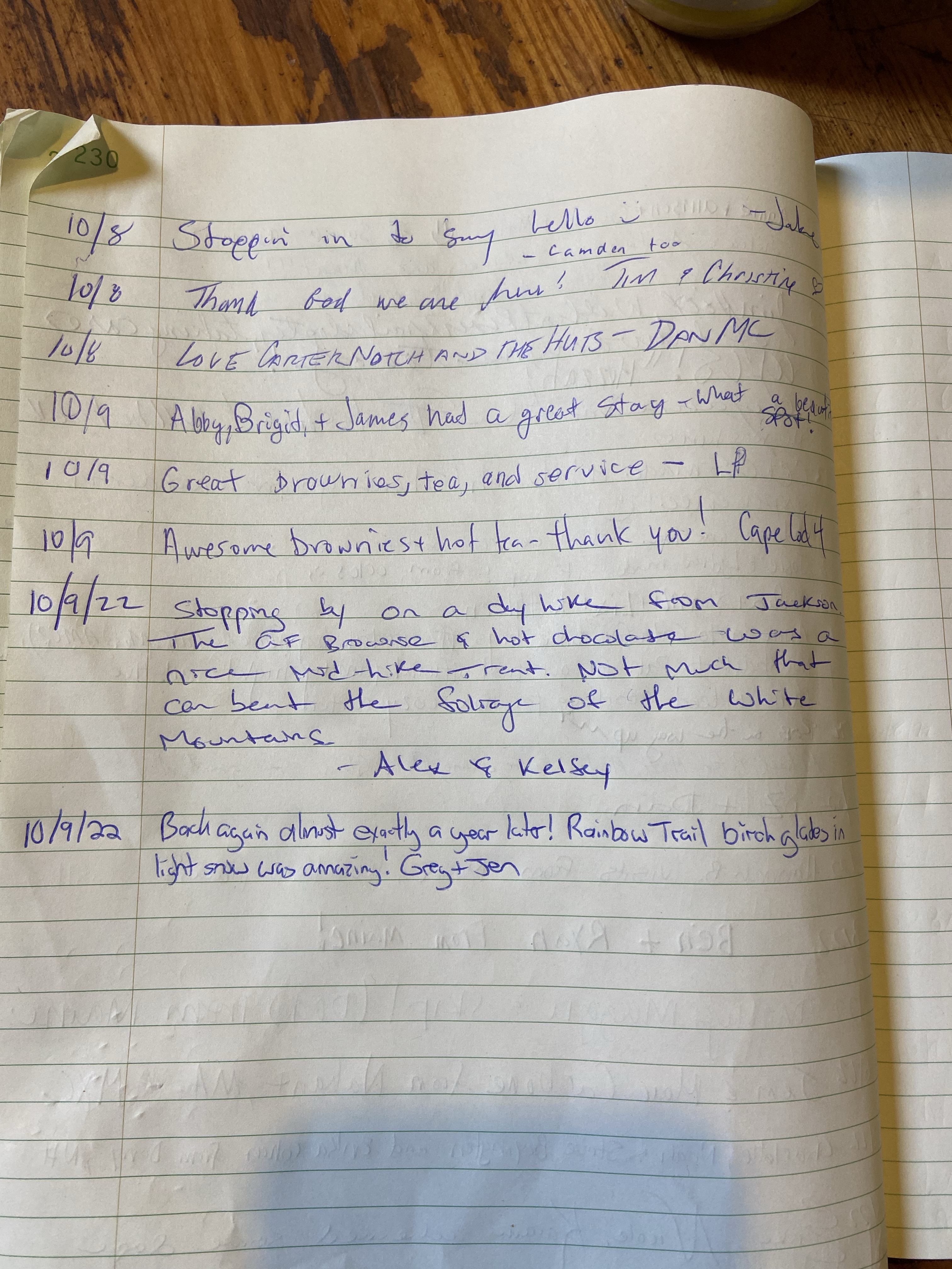 We finally made our way to hut and refiled our water, used the glamourous privys and refueled on some snacks. We also looked through the guest book and found our entry from almost exactly a year before when we visited the hut for my final 48-4K hit up the Wildcats. We warmed up and headed out for the final push and last leg of our ~11 mile loop back to the car via the Wildcat River trail and back on the Bog Brook Trail.